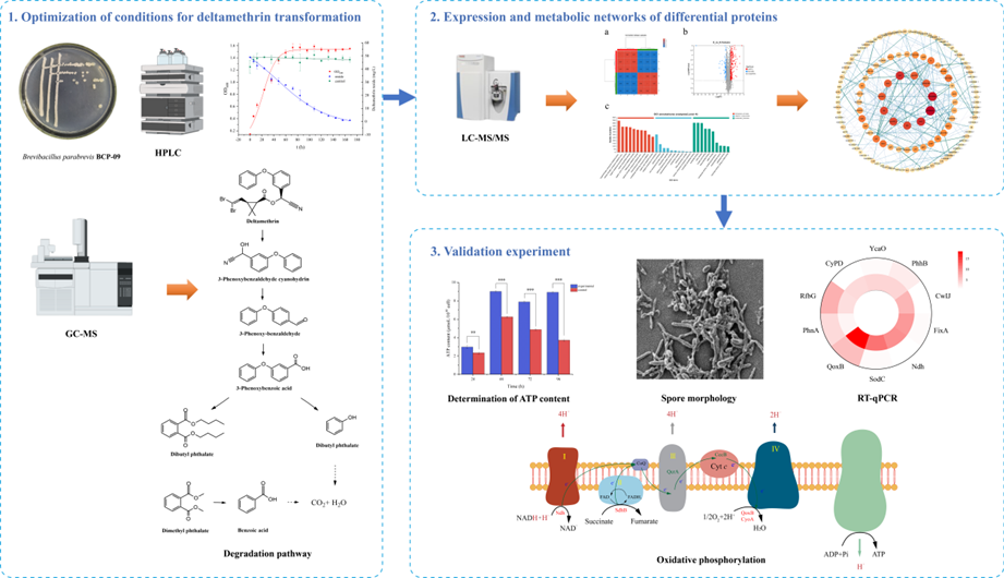 在溴氰菊酯的胁迫下,菌株BCP-09中代谢相关蛋白显著上调,促进了细胞代谢和分子功能,使ATP产生增加;同时,孢子形成有助于菌株BCP-09抵抗溴氰菊酯毒性并增强其降解能力。该研究为消除拟除虫菊酯类农药残留及其中间代谢产物提供了优良的菌株资源和酶资源。
