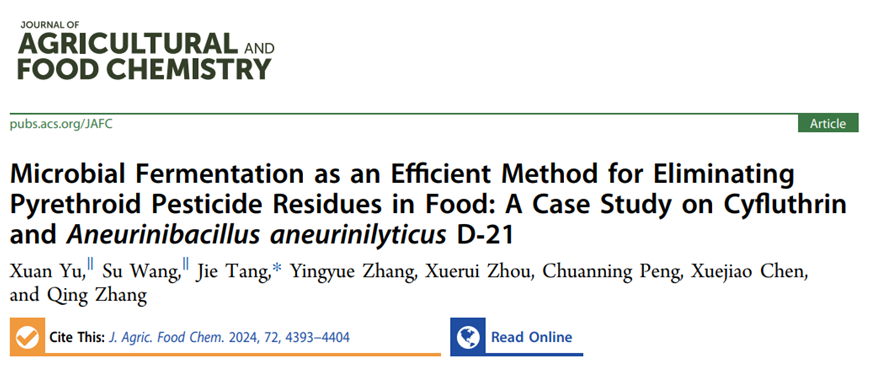 余萱,王素,唐洁(通讯作者)等在《Journal of Agricultural and Food Chemistry》期刊中发表的“Microbial Fermentation as an Efficient Method for Eliminating Pyrethroid Pesticide Residues in Food: A Case Study on Cyfluthrin and Aneurinibacillus aneurinilyticus D21发现从传统发酵食品——郫县豆瓣中筛选得到的解硫胺素芽孢杆菌D-21可以有效降解氟氯氰菊酯,并将全基因组和代谢组数据结合分析揭示了氟氯氰菊酯生物降解的新途径。