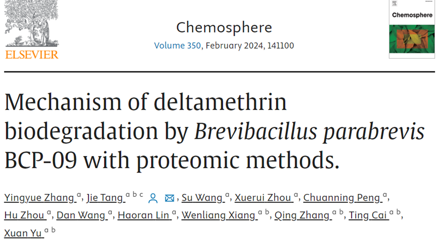 张潆月,唐洁(通讯作者)等在《Chemosphere》期刊中发表的“Mechanism of deltamethrin biodegradation by Brevibacillus parabrevis BCP-09 with proteomic methods阐述了食品源微生物类短短芽孢杆菌BCP-09对溴氰菊酯的降解特性,并结合蛋白组分析技术从多个角度探讨了该菌对溴氰菊酯的降解机制。