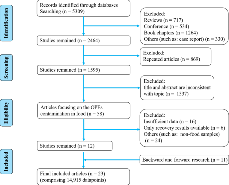 收集了23篇实证研究文献中的14,915条食品中OPEs污染含量的数据,并根据其食品类别的不同,利用meta分析探究了各种OPEs在不同类型食品中的污染水平。