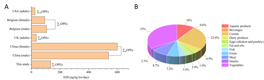 Fig. 2. Estimated dietary intakes (EDI) and risk assessment. (A) Comparison of EDI values of OPEs in food between this study and empirical research conducted in different countries. (B) Contribution of different food categories to the total estimated daily per capita dietary intakes for the adult population (EDI = 135.41 ng/g bw/day).