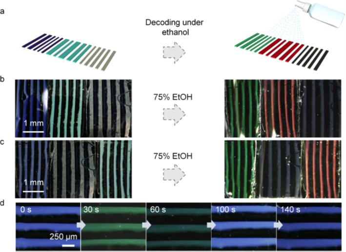 针对以上问题,该团队基于前期研究基础设计了一种通过调控固液气三相接触线的快速移动在二维或复杂三维表面组装纳米颗粒的方法,实现了规整、可扩展和可调的结构色条纹制备。据了解,这是首次通过加速挥发自组装在大面积基底上实现了结构色条纹的规整和可扩展生长。并且,通过在组装表面整合高分子材料,得到了形貌、颜色、表面化学和环境刺激响应性能可调的反蛋白石结构色条纹。该研究将获得的结构色条纹应用于防伪识别、软体机器和干细胞操纵等领域,证明了该自组装方法和相应的结构色条纹在相关领域的前景和应用价值。