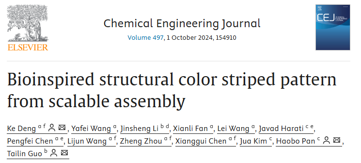 近日,365电子娱乐官方网站食品营养与安全团队青年教师邓科博士在国际Top学术期刊《Chemical Engineering Journal》 (Q1, IF: 13.2)发表题为“Bioinspired structural color striped pattern from scalable assembly”的研究论文。邓科博士为该论文的第一作者及通讯作者, 2022级硕士研究生王亚飞为该论文的第二作者,西华大学为第一通讯单位,陈祥贵教授等团队老师为本研究工作提供了重要指导和帮助。中国科学院深圳先进技术研究院潘浩波研究员和西南交通大学郭泰林教授为该论文的共同通讯作者。该研究工作得到了匿名审稿人的高度评价:“Based on interesting experimental phenomenon and strong scalability, this work would promote the wide application in sensing, artificial robots, anti-counterfeiting”。该研究工作得到了教育部春晖计划研究项目(HZKY20220582)、西华大学校人才引进项目(Z211063)和四川省科技计划(2682023ZTPY076, 2682020ZT80)等项目的支持。