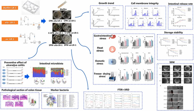 本研究利用3种不同的壁材果胶钙珠粒(CPB)、壳聚糖-果胶钙珠粒(C-CPB)和海藻酸钠-果胶-乳清珠粒(SPW)分别对类植物乳杆菌L. paraplantarum LR-1进行微囊化,并制备了外源性微胶囊和内源性生物被膜微胶囊。本研究评价了微胶囊的形态学、细胞密度、理化性质、结构特征、耐药性、释放能力以及对结肠炎的预防作用,其结果为开发新一代益生菌提供了有价值的见解。