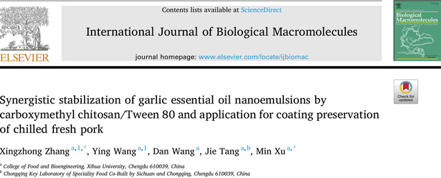 张兴中,王颖,王丹,唐洁,徐敏(通讯作者)等在《International Journal of Biological Macromolecules》期刊中发表的“Synergistic stabilization of garlic essential oil nanoemulsions by carboxymethyl chitosan/Tween 80 and application for coating preservation of chilled fresh pork”通过高压微射流化制备了由羧甲基壳聚糖(CCS)和Tween 80(TW 80)协同稳定的大蒜精油(GEO)纳米乳液,并应用于冷鲜猪肉的涂膜保鲜。