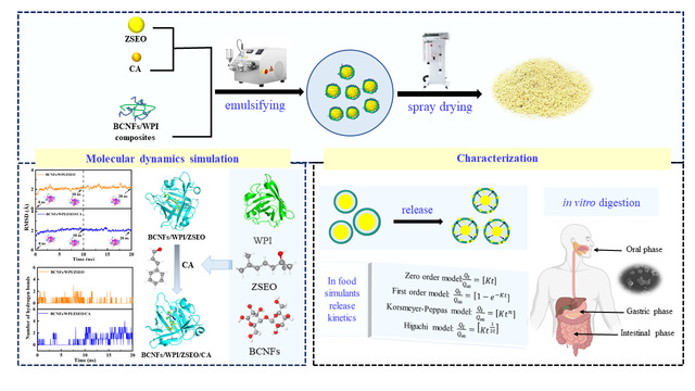 光谱分析和分子动力学模拟表明CA和BCNFs/WPI/ZSEO组分之间存在氢键、疏水、静电相互作用,且CA的存在增加了微胶囊的结合能。