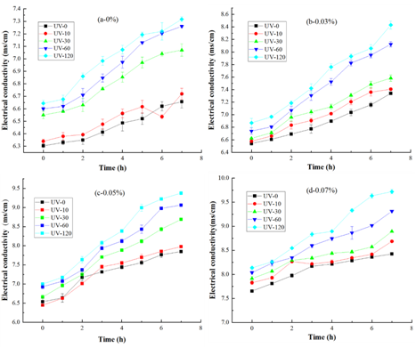 Figure.3. UV Illumination of CTS-TiO2-Ag composite film containing of nano-TiO2for theelectrical conductivity of C. gloeosporioides liquid (a) 0%; (b) 0.03%; (c) 0.05%; (d) 0.07%.