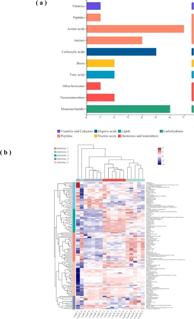 Figure 4 Classification of metabolites obtained from KEGG annotation (a) and Clustering heat map (b)