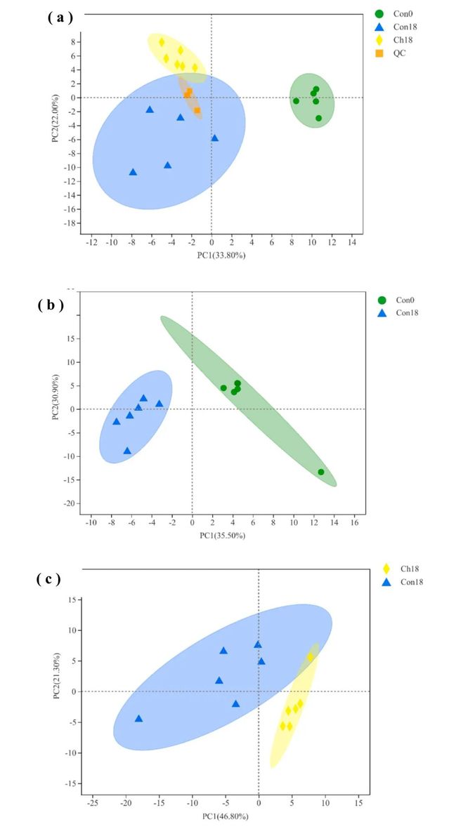 Fig. 7. OPLS-DA replacement verification Con18 vs Con0 (a), Ch18 vs Con18 (b).