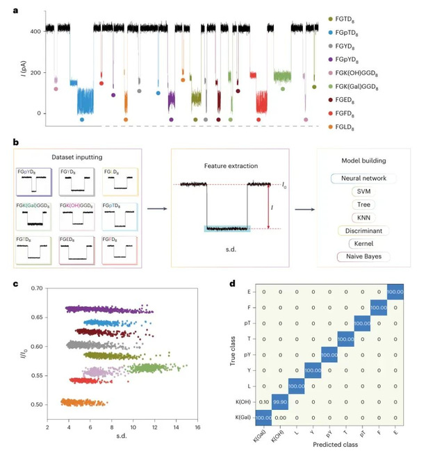 进一步介绍了如何利用机器学习算法来识别和区分九种不同肽探针的电流信号。通过提取每个信号的电流阻断(I/I₀)和标准差(s.d.)作为特征参数,构建了训练数据集,并使用多种机器学习模型进行训练和测试。其中,支持向量机(SVM)模型表现最佳,测试准确率达到了100%。图中还展示了九种肽探针的电流信号散点图和混淆矩阵,证明了该方法能够准确地识别和区分不同肽探针的电流信号,为实现多种生物标志物的同时检测提供了基础。