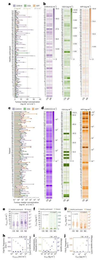 图中展示了纳米孔基酶联免疫吸附测定(NELISA)技术在临床血液样本中对三种肿瘤标志物(CA19-9、CEA和AFP)的检测结果。研究团队对54名健康参与者和57名癌症患者的血液样本进行了检测,结果显示NELISA技术能够准确地检测出这些生物标志物的浓度,并且与传统的化学发光免疫分析(CLIA)结果高度一致。通过对比两种检测方法的检测限(LOD),发现NELISA的检测限比CLIA低两到四个数量级,这表明NELISA技术在检测灵敏度上具有显著优势。此外,图中还通过箱线图展示了两种检测方法在不同样本组中的数据分布情况,进一步证实了NELISA技术在实际应用中的可靠性和准确性。