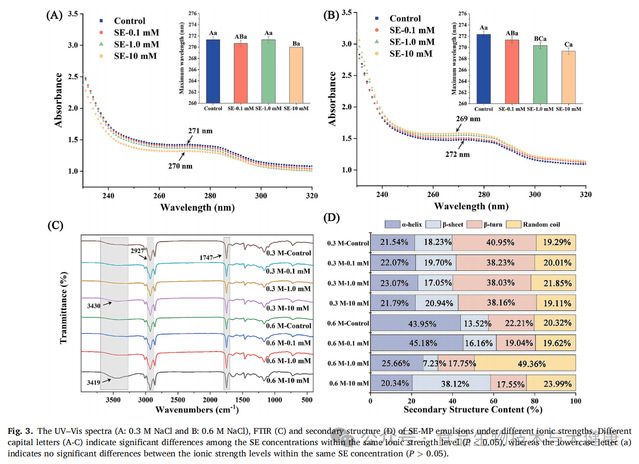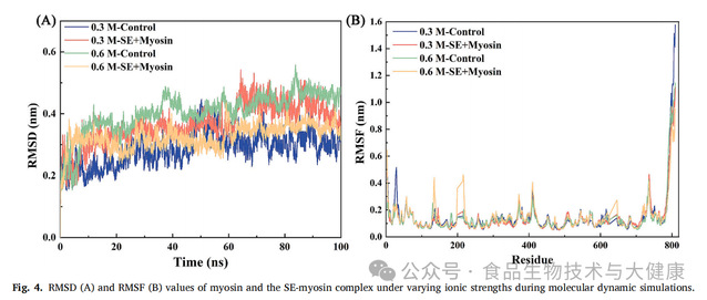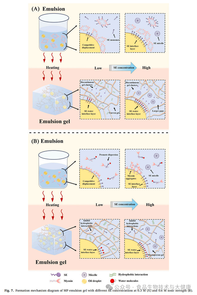 该研究考察了蔗糖酯(浓度分别为0.1、1.0和10 mmol/L)在两种离子强度(0.3mol/L和0.6mol/L)条件下对肌原纤维蛋白乳化凝胶的影响。结果表明:在0.3mol/L离子强度下,随着蔗糖酯浓度升高,乳液液滴粒径增大(从31.86μm增至55.97μm),ζ电位绝对值升高(从29.60mV增至47.57mV);此外,该离子强度下蔗糖酯浓度升高会促进蛋白质折叠,而在0.6mol/L离子强度下则会诱导蛋白质解折叠。具体而言,在0.6mol/L离子强度下,蔗糖酯浓度升高使蛋白质的α-螺旋含量降低(从45%降至20%)。分子动力学模拟结果显示,高离子强度(0.6mol/L)可促进蔗糖酯与肌球蛋白之间形成稳定结合。同时,无论离子强度如何,蔗糖酯浓度升高均会产生以下影响:削弱凝胶强度、增加体系中自由水含量,且在流变学特性上增强粘性主导(即体系更偏向流体特性而非弹性固体特性)。
