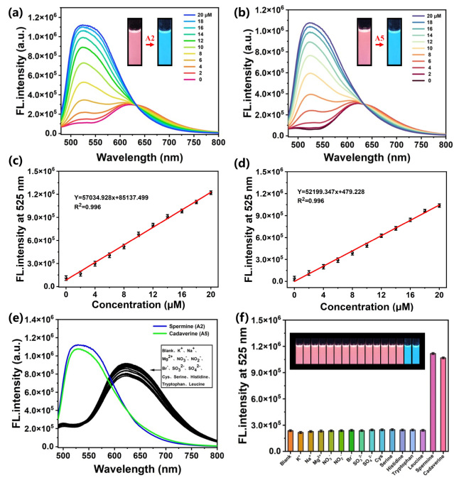 Figure 3. (a) Fluorescent emission of BTPC-Ta solution over different concentrations of spermine (A2); (b) Fluorescent emission of BTPC-Ta solution over different concentrations of cadaverine (A5); (c) LOD extracted from (a); (d) LOD extracted from (b). [BTPC-Ta] = [A1, A2, A3, A4, A5] = 50 μΜ; solvent: HPLC DMSO. (e) Fluorescence spectra of BTPC-Ta (10 μΜ) in the presence of spermine and cadaverine and various analytes: K+, Na+, Mg2+, NO3-, NO2-, Br-, SO32-, SO42-, cysteine (Cys), serine, histidine, tryptophan, leucine, spermine and cadaverine (10 μM). (f) Histogram of fluorescence (F525 nm) shown in (e); Inset: photographs of BTPC-Ta in the presence of spermine and cadaverine and various analytes were recorded under 365 nm.