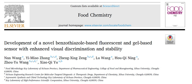 近日,食品与生物工程学院王楠老师在食品领域TOP期刊 《Food Chemistry》 (Q1,IF: 9.8)发表题为“Development of a Novel Benzothiazole-Based Fluorescent and Gel-Based Sensor with Enhanced Visual Discrimination and Stability”的研究论文。王楠老师为论文第一作者,理学院王周玉教授为本论文的通讯作者。食品与生物工程学院宁厚齐老师、余孝其教授为本研究工作提供了重要支持,西华大学为本论文唯一完成单位。