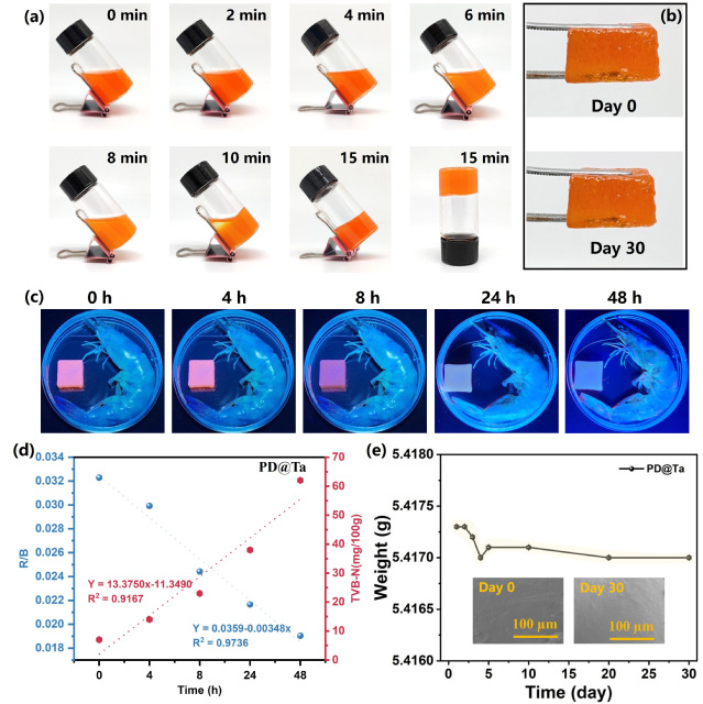 Figure 7. (a) Gelation process of PD@Ta; (b) Comparison of the morphology of PD@Ta after 30 days of storage at room temperature; (c) Fluorescence photos of the gel sensor PD@Ta monitoring the spoilage process of shrimp at 25℃; (d) The time-dependent curve of the R/B ratio for TVB-N and PD@Ta gel; (e) Mass changes of PD@Ta over 30 days, with inset images showing SEM cross sectional images of PD@Ta on day 0 and day 30.