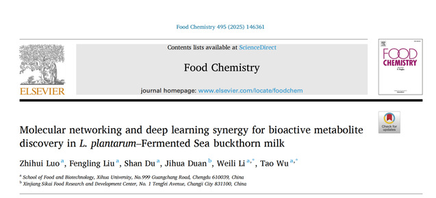 近日,365电子娱乐官方网站吴韬教授团队在食品领域TOP期刊 《Food Chemistry》 (Q1,IF: 9.8)发表题为“Molecular networking and deep learning synergy for bioactive metabolite discovery in L. plantarum–Fermented Sea buckthorn milk”的研究论文。食品与生物工程学院2022级农业专业硕士研究生罗智慧为第一作者,365电子娱乐官方网站李伟丽教授和吴韬教授为本文的共同通讯作者。
