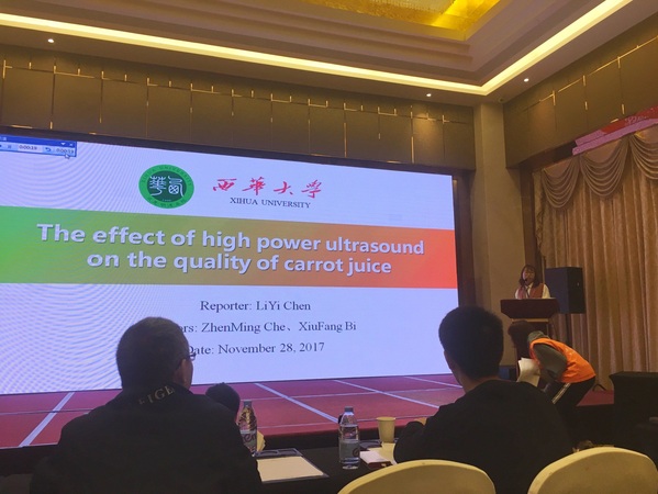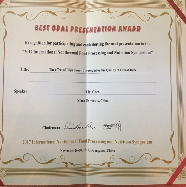 1128日,我校食品与生物工程学院毕秀芳博士的研究生陈丽伊在2017食品非热加工与营养国际会议上做15分钟的全英文报告“The effect of high power ultrasound on the quality of carrot juice”,该生报告流畅,回答提问时自信从容,获得参会嘉宾的一致好评,并最终获得“最佳口头报告奖”,在各国专家面前充分展现了西华学子的风采。