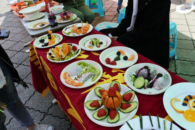 第二部分线下活动“水果拼盘”和“美食游园会”于4月1日在明德广场开展。水果拼盘中,各小组通过相互协作,将不同造型和颜色的水果经雕刻、拼凑、融合,创造出形态各异、色彩缤纷的艺术品;美食游园会设置有“以食会友”、“美食大问答”、“水瓶挑战”、“酸甜苦辣”、“美食套圈”等趣味活动,吸引大量同学热情参与,同学们在享受活动乐趣的同时,也能学习相关美食知识。现场热闹非凡,同学们玩得不亦乐乎。