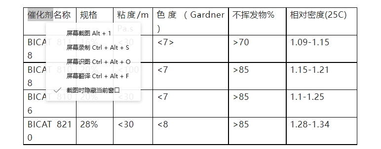 与锡催化剂相比,环保型的bicat 铋类催化剂,无毒,催化活性高,对nco基团选择性更好,可以有效促进-nco与-oh的反应速度, 制成的终产品力学性更佳,诱导时间短,粘度逐渐增加。bicat系列产品的具体参数如下