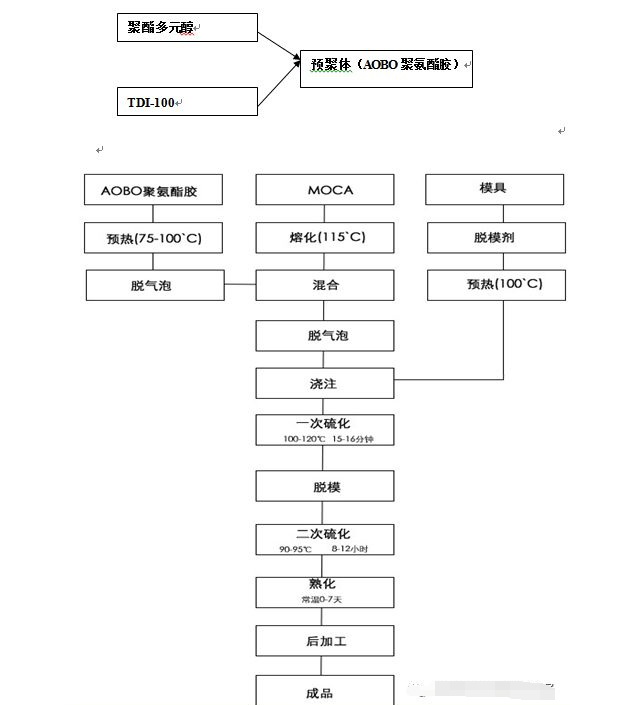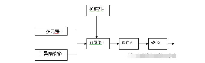 将聚合物二元醇和二异氰酸酯制成预聚体放在一起充分混合,经真空脱泡后注入模具注入模具固化,而后硫化得产品,详见如下图: