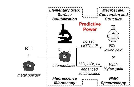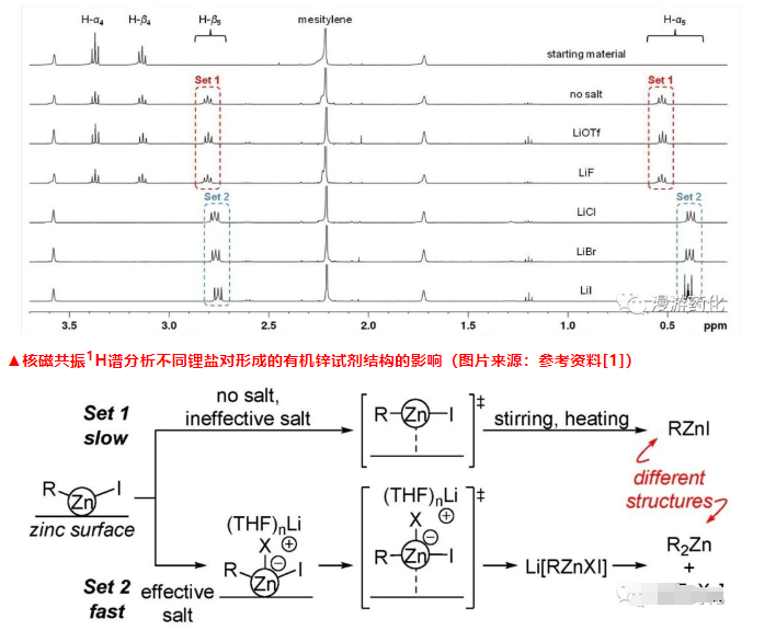 为了探究某一化学反应的作用机制,人们发展了越来越多的检测手段进行分析与验证。而随着反应类型的日益增多与复杂化,现有的分析方法有时无法满足人们对机理研究的需求。例如,德国慕尼黑大学的paul knochel教授在有机金属试剂(如格氏试剂、有机锌试剂)的研究中做出了重要的贡献。2006年,他发现licl可以加速卤代烃对金属zn的插入形成有机锌试剂,而在此之前只有格氏试剂可以通过卤代烃直接插入金属单质的方式行制备。这一发现随后引领了一系列其他有机金属试剂的高效合成,如有机铟、有机锰、有机铝试剂等。