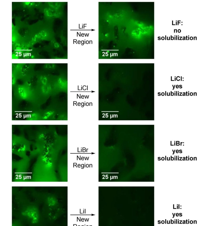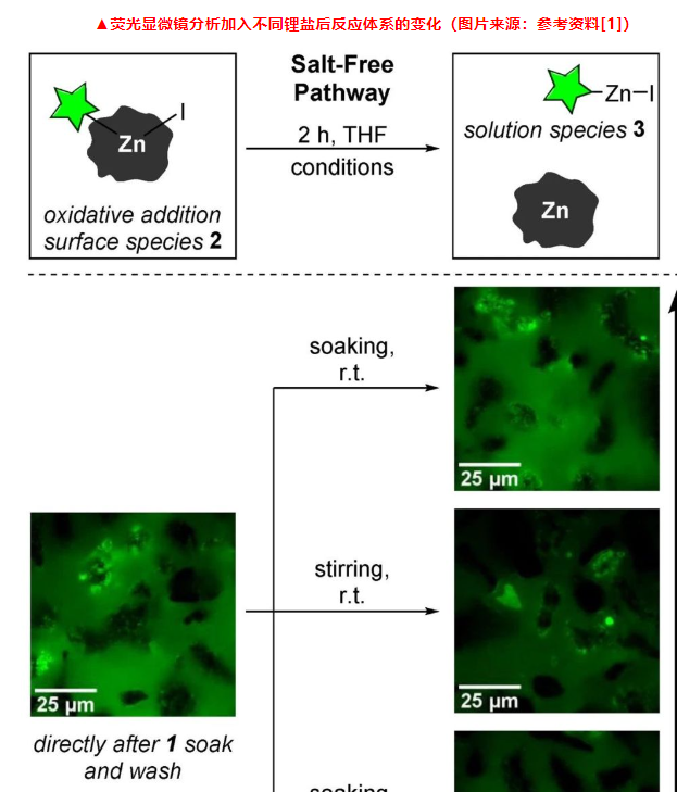 在未加入任何锂盐的情况下,亮绿色的2稳定存在,但加入licl后迅速溶解,荧光消失。作者还考察了其他的卤化锂(lix, x = f, br, i)盐及liotf对2的影响,发现libr、lii同样可用作促进合成有机锌试剂的添加剂。他们还在未加入任何锂盐的情况下分别对体系进行搅拌和加热,实验结果表明,前者可使2发生部分溶解,后者则可使2大幅度溶解,但溶解速率明显慢于lix (x = cl, br, i)存在的情况。这些重要的信息通过传统的检测手段是无法得到的,由此体现了荧光显微技术在灵敏度及空间定位方面具有极大的优势。