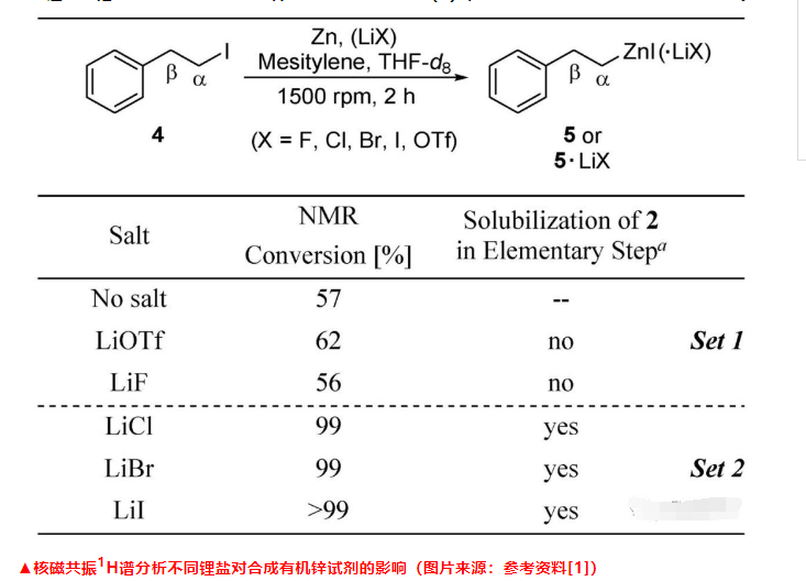 为了验证荧光显微镜观察到的结果是否能有效预测哪种盐可以促进有机锌试剂的合成,作者又进一步设计了核磁共振1h谱实验,以(2-碘乙基)(4)作为模板底物,研究其转化为相应有机锌试剂(5)的反应情况。他们发现在不加入锂盐以及加入lix (x = f, otf)时转化率较低(记作第1组),而加入lix (x = cl, br, i)时几乎以定量的转化率发生反应(记作第2组)。由此可推断,第2组锂盐可溶解锌金属表面形成的氧化加成表面中间体(2),是加速形成有机锌试剂的重要原因。