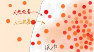 纸巾有很多细小的孔,这些微孔能够吸附着色剂。从视频中大致能判断出,饮料的颜色主要来自于柠檬黄和落日黄,这是两种在食品中广泛使用的合成色素。一般而言,不管是天然还是人工合成的色素,都容易被吸附性好的滤纸或滤器吸附,从有色的饮料中“脱离”出来。