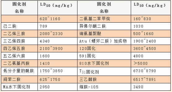 尤其是胺类固化剂是未固化环氧树脂胶黏剂毒性的主要来源,曾沿用多年的乙二胺固化剂挥发性大,蒸气压高,对口腔、呼吸道黏膜和肺部都有严重的刺激作用,皮肤接触后会引起过敏、瘙痒、水肿,甚至产生红斑、溃烂,将原有的胺类固化剂进行改性是降低毒性或实施无毒的重要途径。常用胺类固化剂的ld50指标见下表: