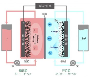 锌碘液流电池体系于2014年首次提出,对于碘正极而言,在充电过程中i- 会被氧化成i2 ,由于i-的配位作用,i2会以i3-的形式溶解,从而避免了其析出,放电反应则发生逆过程,i3- 重新被还原为i-。