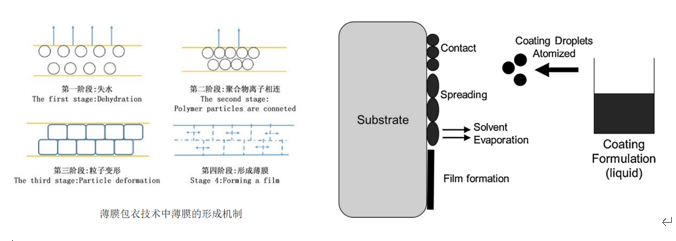 薄膜包衣技术的原理即将包衣溶液或混悬液以喷雾的方式喷射到片芯的表面,通过接触、铺展、液滴间的相互聚结作用而在片芯表面形成的一层衣膜。如果以成膜材料是否在介质中溶解为依据,包衣材料可以分为溶液型和分散型,溶液型包衣液是通过雾化、接触片面并铺展、溶剂蒸发、聚合物链相互渗透,经历凝胶状态,然后进一步干燥形成薄膜;而分散型(雾滴内成膜材料是混悬状态)即通过雾化、接触片面并铺展、溶剂蒸发、互不连接的独立分子进一步加热(超过低成膜温度)、软化、流动,相互连接成膜。