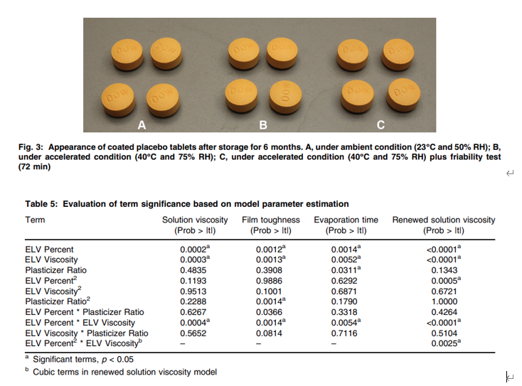 例如有文献研究:原低分子量hpmc(hypromellose 2906, vlv)的薄膜包衣配方,因该种聚合物薄膜机械强度较弱,会导致薄膜包衣片的稳定性问题,而在该配方中,添加少量5 wt%常规的hpmc(3.35 wt% hpmc e50和1.65 wt% hpmc e3)时,优化后的包衣配方可显著提高包衣膜的韧性从而提高片剂的贮存稳定性和质量,同时也大限度地保持了高效的包衣工艺和温和的包衣条件,大程度的规避了“粘片”风险问题。