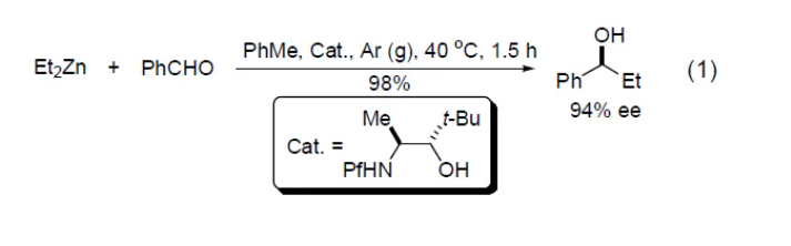 与其它二烷基锌化合物类似,该反应需在无水条件下进行,反应通常用氮气或氩气作为保护气体。例如在溶液中,甲醛与二乙基锌反应几乎定量地生成醇,产物光学纯度高(94%ee) (式1)[2,3],还可以用此方法来进行羟醛缩合反应