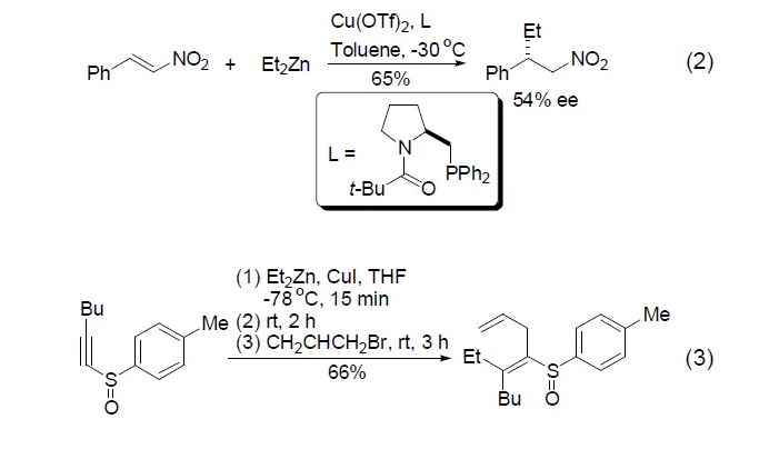 在 cu(otf)2 和适当配体存在下,et2zn 及其高级同系物易与活化的烯烃发生加成反应在cui催化下,活性较低的炔烃也能与二乙基锌发生立体专一性的加成反应 (式3)[6]。