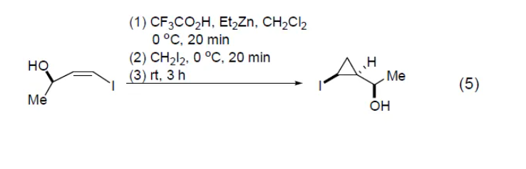 形成三元环et2zn 与二碘甲烷很快反应生成ich2znet,并进一步生成(ich2)2zn,两者都能很好地与双键加成形成三元环化合物