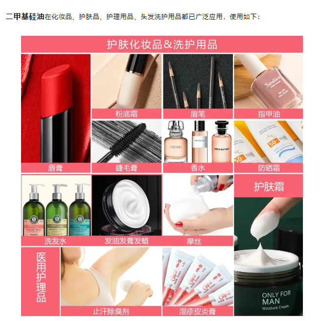 二甲基硅油在化妆品、护肤品、护理用品、头发洗护用品都已广泛应用,使用如下: