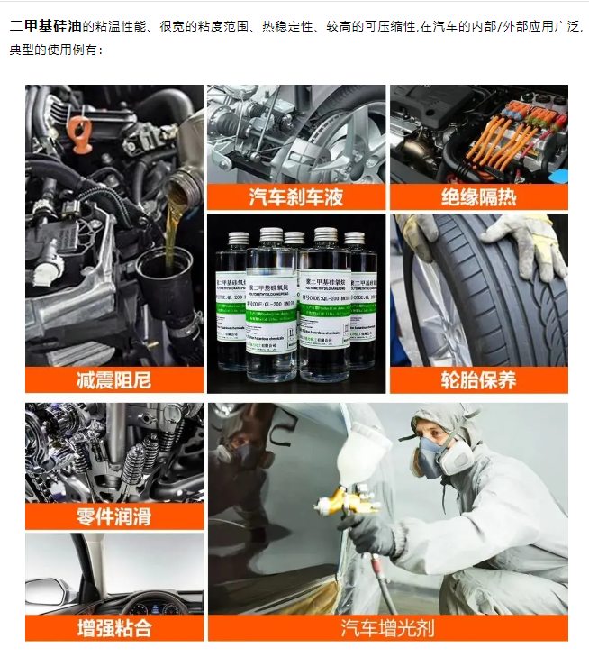 二甲基硅油的粘温性能、很宽的粘度范围、热稳定性、较高的可压缩性,在汽车的内部/外部应用广泛,典型的使用例有: