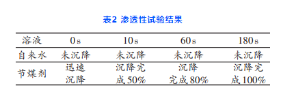 渗透性实验。通过渗透性实验观察判断节煤剂的渗透性,实验方法如下:取两个100ml比色管分别加入50ml去离子水和节煤剂,称取一定质量的煤粉,同时加入到两个比色管内,观察煤粉的沉降情况,以判断节煤剂的渗透性。渗透性结果见表2,从表2中可以看出本煤粉在节煤剂中迅速沉降,表明节煤剂中分散渗透组份起到了比较明显的作用,节煤剂能迅速的渗透至煤层内部,充分发挥其功效。