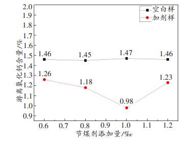 取空白样品和添加节煤剂的样品添加一定比例的水并采用模具压制成圆柱体,105℃下烘干60min,在900℃的马弗炉焙烧30min,后立即转入1400℃马弗炉内焙烧30min,取出后立即使用工业风扇迅速冷却得到黑色样品,参照gb/t 176-2017 《水泥化学分析方法》中的测试方法,对研磨后的样品进行f-cao含量测定。