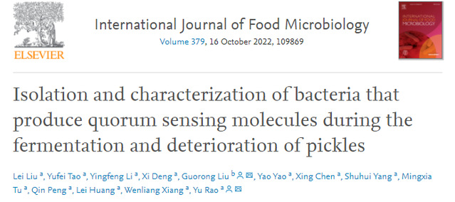 2022年8月,365电子娱乐官方网站刘蕾副教授、饶瑜教授团队在国际期刊International Journal of Food Microbiology(Q1,IF: 5.911)发表题为“Isolation and characterization of bacteria that produce quorum sensing molecules during the fermentation and deterioration of pickles”的研究性论文。获国家自然科学基金(32001663)资助。