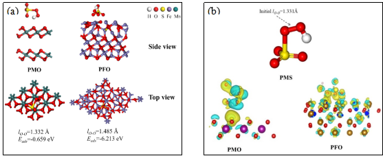 Fig. 2. (a) A series of results for DFT calculations; (b) the chargedifference distribution (CDD) of different PMS adsorption models.