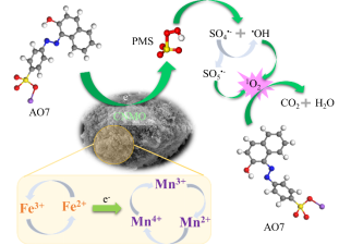 为此,基于将载体与活性组分为一体的思路,提出了一种含铁、锰元素的天然锰矿石作为PMS活化催化剂的催化氧化方法,对催化能力和稳定性进行了评价;对催化剂进行了系统表征,并以橙黄II (OII)为代表污染物进行了一系列催化试验,以确定影响催化能力的主要条件和主要活性组分,提出了一种简单的PMS分解和OII的降解和矿化机理。该系列相关的其他研究成果,还分别公开发表在《RSC Advances》和《应用化工》(CSCD)期刊上。