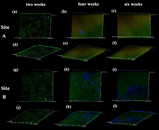 5 MPs碎片表面生物膜的立体结构随暴露时间的动态变化(杨鑫等,Science of the Total Environment 2021