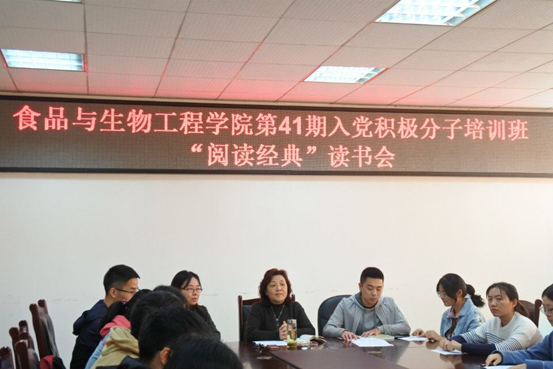 10月25日中午,食品与生物工程学院于5D-419举行了第41期党校学员“阅读经典”读书会活动,与会人员有:党委书记周彬儒老师,党校指导老师王雁老师,以及第41期入党积极分子培训班班长、组长和全体学员。