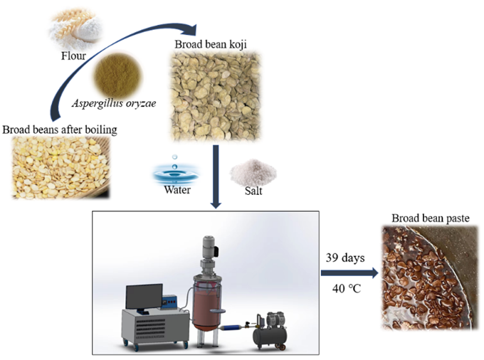 郫县豆瓣是著名的发酵调味品,被誉为“川菜之魂”。郫县豆瓣的制造技术已被认定为国家级非物质文化遗产,并被列入郫都区地理标志保护产品。郫县豆瓣的发酵过程分为前发酵和后发酵,前发酵又称甜瓣子发酵。甜瓣子发酵是郫县豆瓣发酵过程中重要的过程之一,它决定了郫县豆瓣的风味和产品质量。郫县豆瓣传统上采用开放式发酵,但后续产品在发酵过程中容易受到污染,而产品质量难以控制,近年来,罐式发酵设备的应用成为促进郫县豆瓣的标准化和工业化生产的亮点之一,然而罐式发酵甜瓣子的研究还不够成熟,需要大量的研究来奠定郫县豆瓣现代化改造的基础。对于罐式发酵,许多研究都集中在表征风味物质,确定关键的芳香化合物和鉴定微生物多样性上,虽然发酵调味品中的挥发性物质引起了相当多的研究关注,然而相关的产生机制尚不清楚。