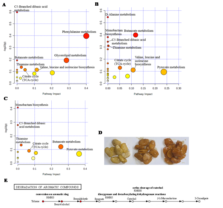 Fig. 6.KEGG pathway-based differential metabolite analysis. (A) The KEGG pathway annotated in the yeast database. (B) The KEGG pathway annotated in the Bacillus database. (C) The KEGG pathway annotated in the Staphylococcus database. The importance of pathways was visualized by the size and color shade of the bubbles. (D) A comparison between the color of the fermented broad beans. Images of the pre-, mid-, and post-fermentation stages are shown from left to right. (E) The degradation of toluene.