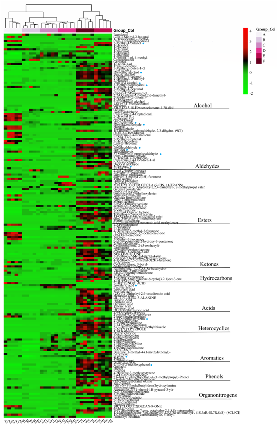 Fig. 5.The heat map of the differential metabolite peak areas. A, B, C, D, E, and F represent the samples collected at 0 d, 6 d, 13 d, 20 d, 28 d, and 39 d of fermentation, respectively, while the numbers 1, 2, 3, 4, and 5 represent parallel experiments. The blue dots indicate the key flavor substances identified in previous studies