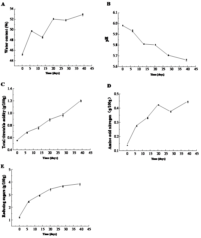 Fig. 2.The physicochemical parameters for the constant temperature fermentation of broad beans. (A) Water content. (B) pH. (C) Total titratable acid. (D) Amino acid nitrogen. (E) Reducing sugars. The experiment for each parameter was performed in triplicate, while the standard error was visualized via an error bar.