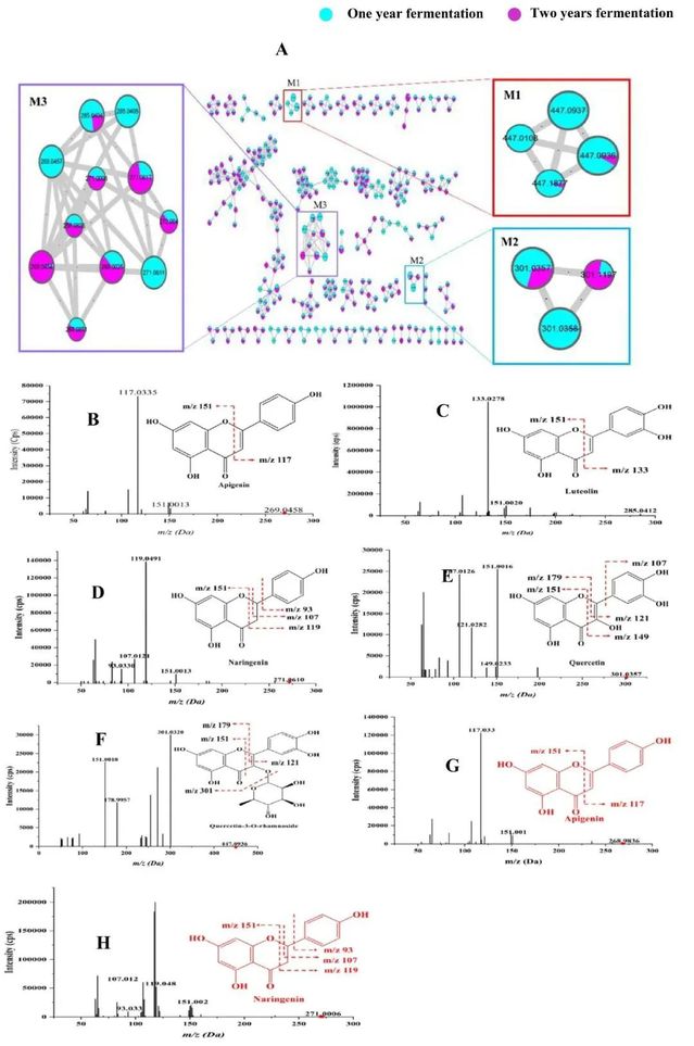 该文采用了整合代谢组学和FBMN方法,全面分析了PXDB在两年的成熟过程中的非挥发性成分。