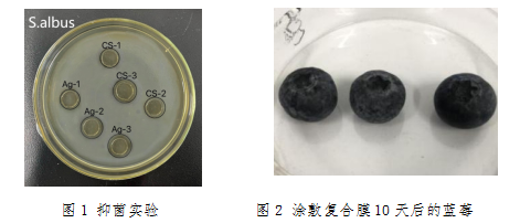 图2:10天时涂膜液的蓝莓表皮出现轻微皱缩,但整体仍圆润光滑。适量的CMC和甘油之间的氢键,促使膜内形成了一种稳定的网状结构,减小了蓝莓中水分的蒸发流失,使蓝莓保持在较新鲜的状态,保鲜效果较好。